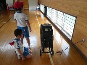 理科の昆虫の観察。木陰を中心に行いました 体育館での運動。扇風機を稼働して行いました