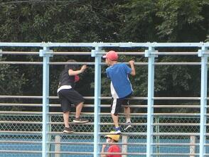 鉄棒は1か所に2人まで。待つ人は離れて待ちます 雲梯も間をあけてします。