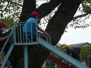 こちらも人気の滑り台 6年生が校長室を掃除機できれいにします