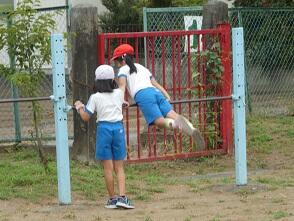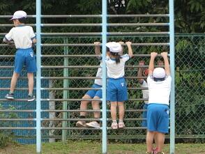 業間休み。鬼ごっこや肋木を使いあそぶこどもたちがいました