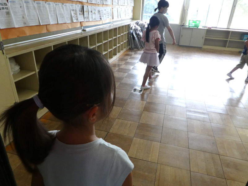 発育測定を待つ6年生。足下にマーカーがあります 身長を測ります。次が体重です。