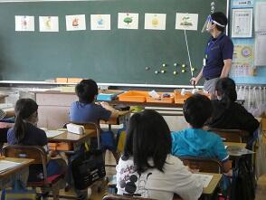 6月25日(木)、朝ふっていた雨が昼前にはやみました。昼休みには校庭で子ども達が楽しそうに遊んでいました。今日も子ども達の様子をご覧ください。(ALTの先生は、フェイスシールドを装着しての指導です。マスクでは口の動きが見えないのでつけています)
