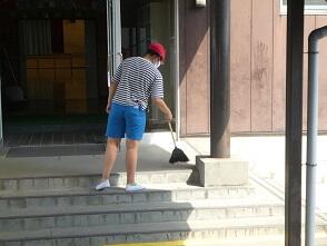 職員玄関前を除草しています 職員室前の廊下を掃除しています