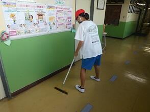 体育館の入口を掃除する6年生 保健室前を掃除する6年生