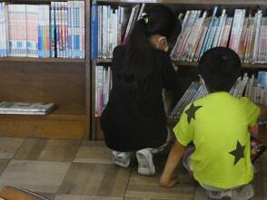 1年生は図書室に本を借りに来ていました。たくさんの本を前に悩んでいる子もいました