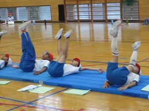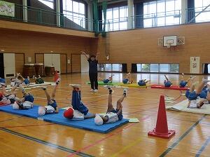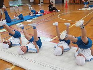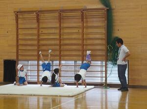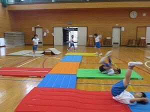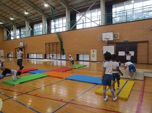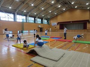 朝から雨が降り、少し蒸し暑さも残りながらの一日でした。体育館にて、1,2年生が、それぞれマット運動をしていました。