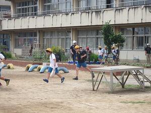 ブランコ側のフェンスの学年の表示前に避難します 下の兄弟のところへ移動して