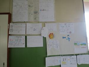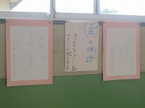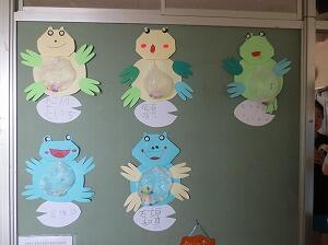 教室棟の廊下の掲示物も、学習参観の時から進化しております。学習した表現物が掲示されてきました。ゆりの木学級では、季節を意識し大きなカエルが掲示れてていました。