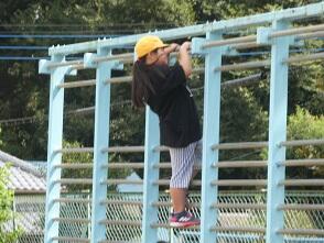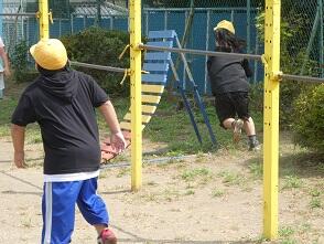 鉄棒は1か所に2人まで。待つ人は離れて待ちます 雲梯も間をあけてします。