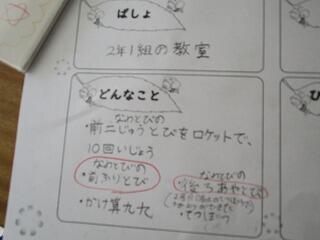 1年生は体育で縄跳びをしました。検定表を見て、自分の目標を確認しながら取り組みました。