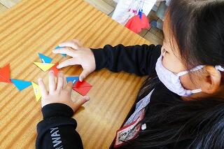 ゆりの木は図工で折り紙を使った工作を行いました。細長く切って、繋げています。