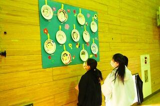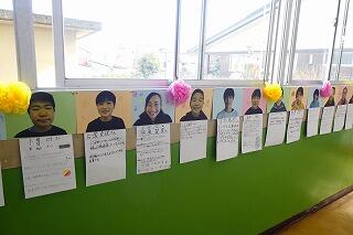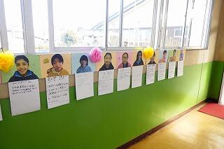 体育館に向かう保健室前の廊下には、5年生が6年生一人一人に向けてのメッセージを添えた「6年生紹介」が貼られており、6年生は嬉しそうに見ていました。