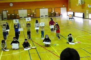次に、2年生の発表です。2年生は、「かけ算九九」を一人の児童が言いながら、他の児童は九九カードを頭の上にあげていました。はっきり聞こえる声ですらすら読み上げていました。最後に6年生に向けてエールを贈りました。