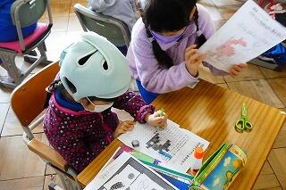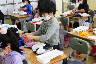 2年生図工で「かぶってへんしん」の学習をしています。今日は、かぶりものの型に紙をつける作業を行いました。