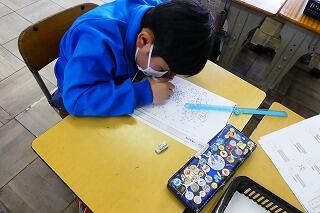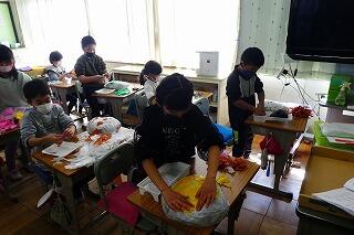 4年生は図工で段ボールを使った工作をしています。色合いやバランス、切り方に気をつけて作業をすす得ました。