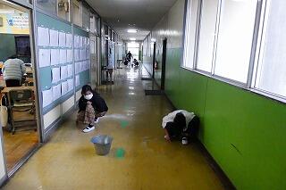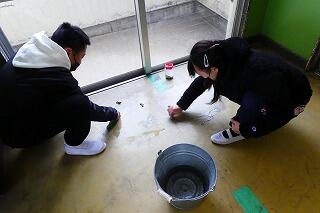 廊下の汚れを、クレンザーを使って削り落としていきます。