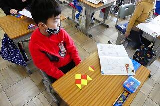 2年生は算数の復習をしています。図形の正方形の確認を行っています。