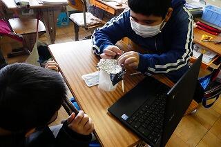 1年生は年明けに予定している幼稚園と保育園との交流会の準備をしました。今日はどんぐりやペットボトルを使って一緒に遊ぶためのおもちゃ作りをしました。