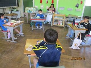 ゆりの木では、人数が少ないので間を十分に空けて給食を食べていました。