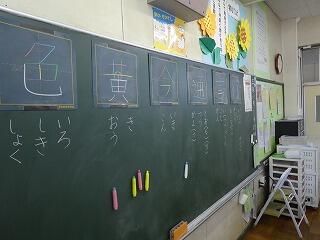2年生は漢字の学習です。先生が書き順を色で示しています。