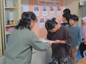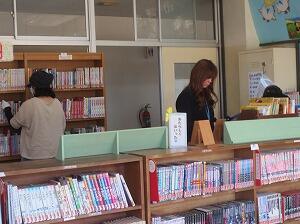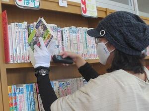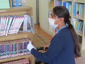 図書室ボランティアさん方 蔵書点検のようす 図書室全部の本を1冊ずつ機械でチェックします