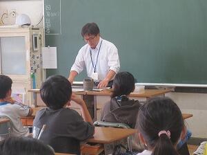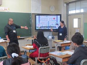 木小のALTは、グレイス先生です。影山先生と一緒に教えていただいています。5年生道案内の授業です。