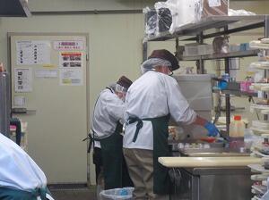 魚をカットしている様子 加工品をパックに入れる機械 お惣菜を作ってる様子