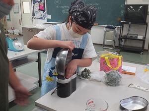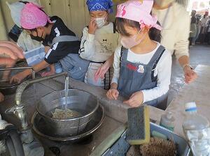 お米を洗い、飯ごうの中に入れます 水加減も学びました