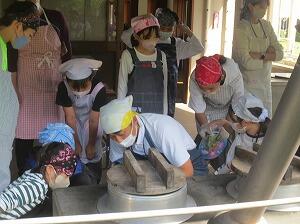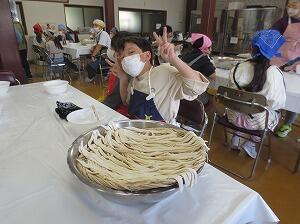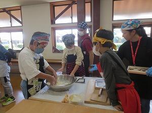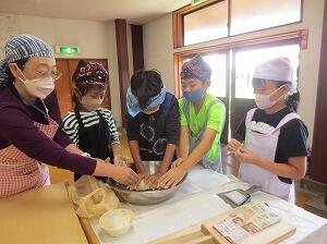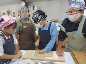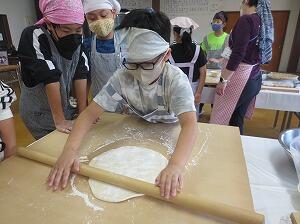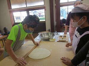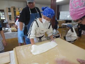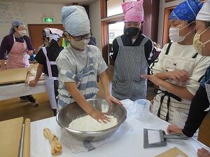 さあ 最後の体験学習 うどん作りです 小麦粉・塩・水のみ 混ぜて・こねて・伸ばして