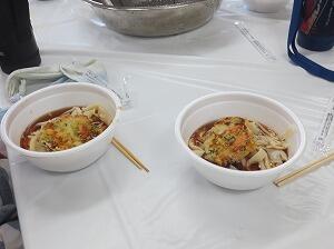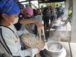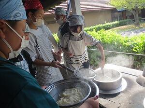 外のかまど 大きな鍋でゆでます 釜揚げうどんの出来上がり