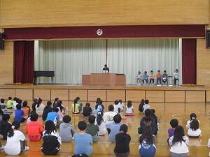 令和7年度前期終業式が体育館で行われました。前半は、代表委員の児童の木小フェスティバル(11月15日)のお願いです。パワーポイントも児童作成、発表も堂々としていて素晴らしかったです。終業式では、7人の代表児童の「前期頑張ったこと」の発表からスタート。一生懸命練習した成果が発表でも出ていました。一人一人、前期頑張ったことを振り返りました。こちらも素晴らしかったです。