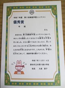 第2回家庭学習コンテストの賞状です。明日児童に渡します。