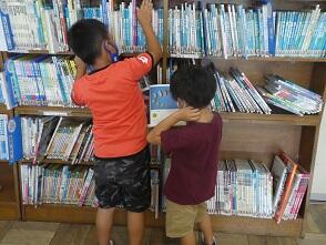 1年生は図書室に本を借りに来ていました。たくさんの本を前に悩んでいる子もいました