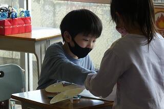 1年生は生活科で「かざわ」を作成しました。外で動かすために組み立てを行っています。