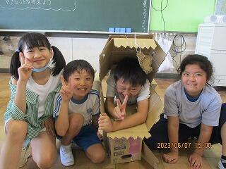4年生の図工では、段ボールを繋げて組み合わせながら素敵な作品を制作していました。