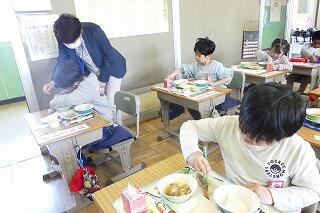 給食当番も先生たちにやり方を教わりながら配膳を頑張っていました。
