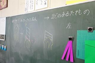 三年生は三角定規の形について考えています。2種類の三角定規を見て、直角、一番尖っている角等の確認をしました。