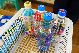 ペンで色を付け、中にビーズや飾りを入れて作りました。