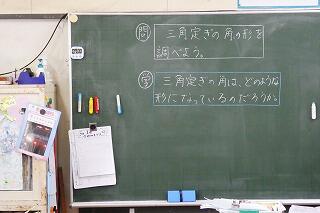 三年生は三角定規の形について考えています。2種類の三角定規を見て、直角、一番尖っている角等の確認をしました。
