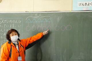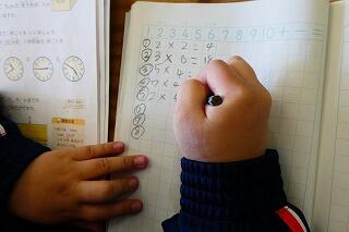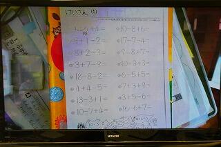1年生は算数の学習の前に計算練習をしました。3つの数をたしたり、ひいたり、速く正確に計算できることを目標としています。目標は5分、みんなできたのでしょうか。