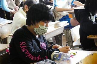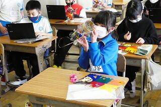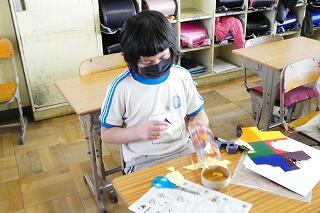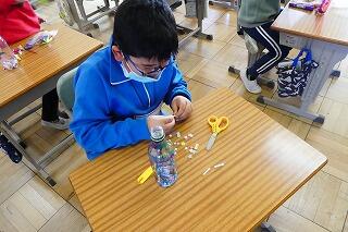 4年生の図工の様子です。「ゆめいろランプ」という作品を作っています。ペットボトルに模様をつけて、ランプの外枠を制作しました。