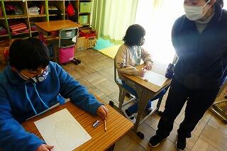 先生の指示を聞いて、目や鼻、口を描いていきます。