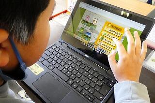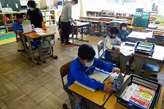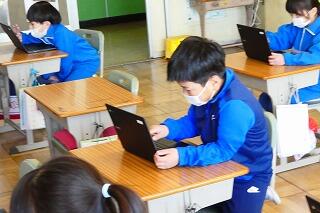一年生はクロームブックを使って、プログラミングの学習をしました。ブロックの意味を考えながら、プログラムが正しく動くように考えています。