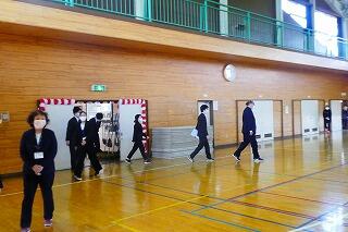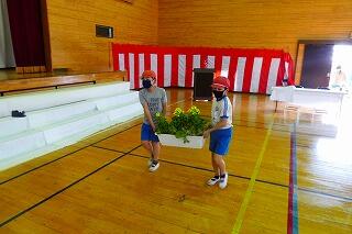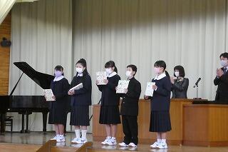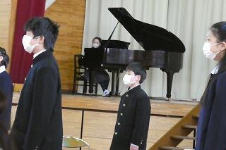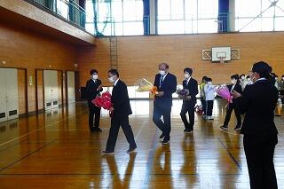代表児童からの花束の贈呈、最後の校歌斉唱。