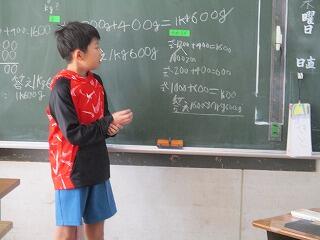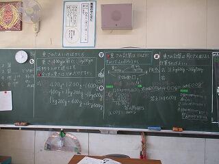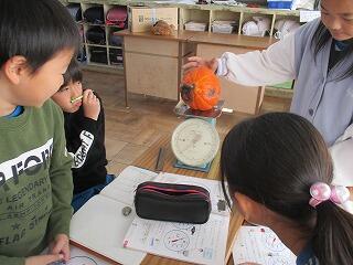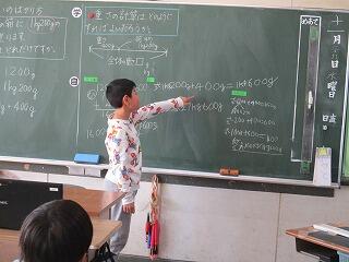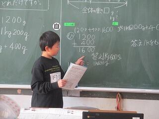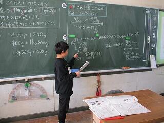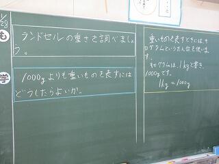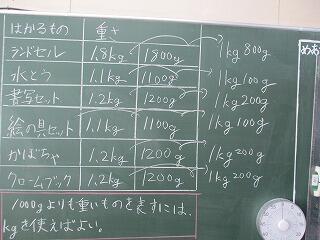 3年生の算数の時間。1000gよりも重いものの表し方(kg)を学習し、身のまわりにあるいろいろなものの重さを量りました。