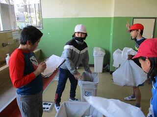 生活委員会が担当して各教室から集められた「もえるごみ」「もえないごみ」を分別して一つの袋にそれぞれまとめる作業。