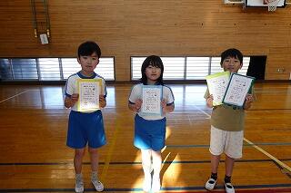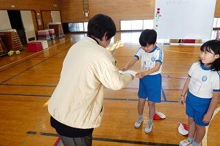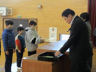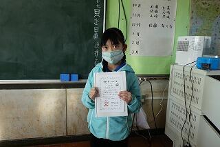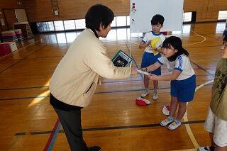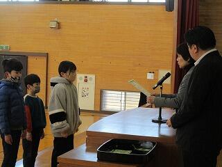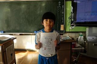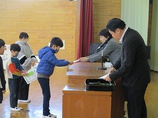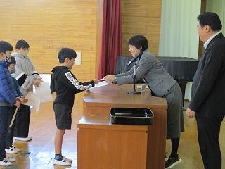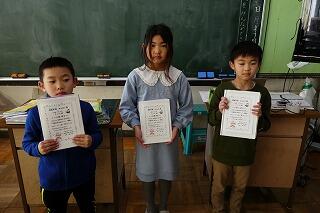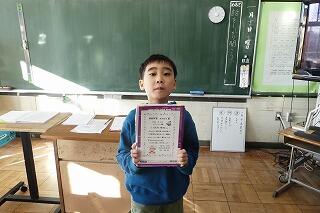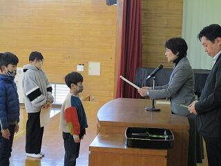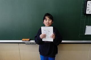 朝会前に、自主学習ノートで全校のお手本となるような学びを進めてきた児童への表彰です。