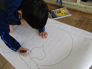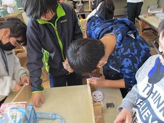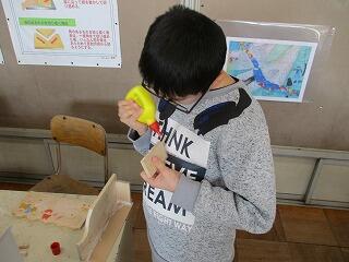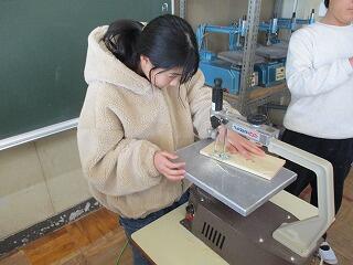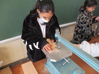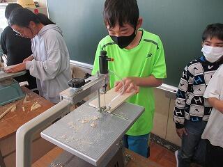 6年生の図工では、糸鋸の機械を使って木を切断しながら作品を作製していました。