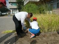 講師の皆さんと稲を刈り取ります。最初はおそるおそる刈り取っていました。