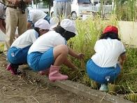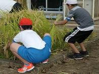 9月5日(木)5年生が地域の皆さんを講師としてお迎えし、稲刈りを行いました。鎌を初めて使う子が多く刈り取りに苦労しました。稲は刈り取る10日くらい前から水を与えない方がよいことや刈り取った稲を逆さまにつるすには理由があることなどを教えていただきました。講師の皆様本当にありがとうございました。